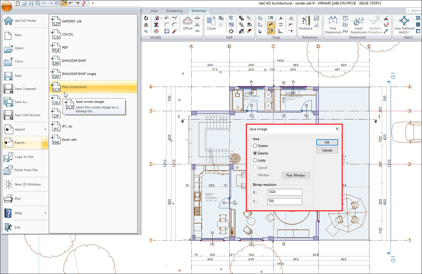 Click the ideCAD icon/Export/Plan Screenshot icon in the ribbon menu .