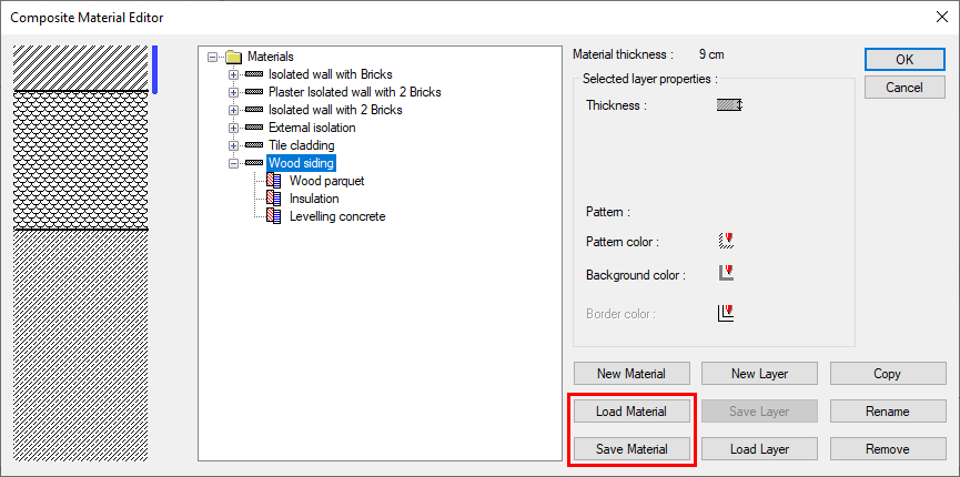 You can access the Save and load material commands from the Composite Material Editor dialog that opens when you click the Composite Materials icon .