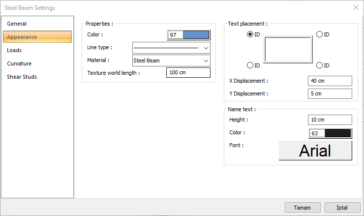 Name text ![]() The height of the beam name text is entered. The color box is slid over the color palette that is opened by clicking and holding down the button with the left mouse button. The button is released when the desired color is reached. The color box turns into the selected color. If clicked together with the Shift key, the pen thickness of the relevant color can be adjusted. If the button below is clicked, the Font Settings dialog opens. Beam Name Text, font type is set from this dialog. |