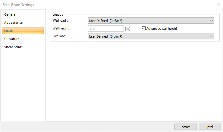 Live load ![]() It is the extra additional live load that can be defined on the beam. It can be used if extra load is defined outside the system to the beam. The appropriate value is selected from the list. The loads in the list are those defined in the load library. If you want to specify a value other than these values as load, the user defined line is selected from the list and the appropriate value is given. |