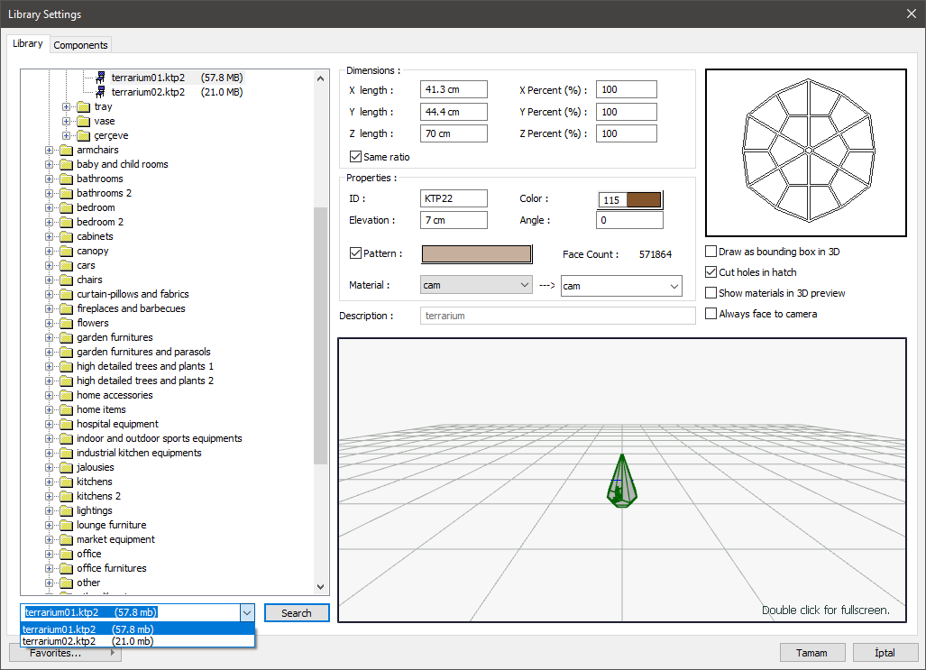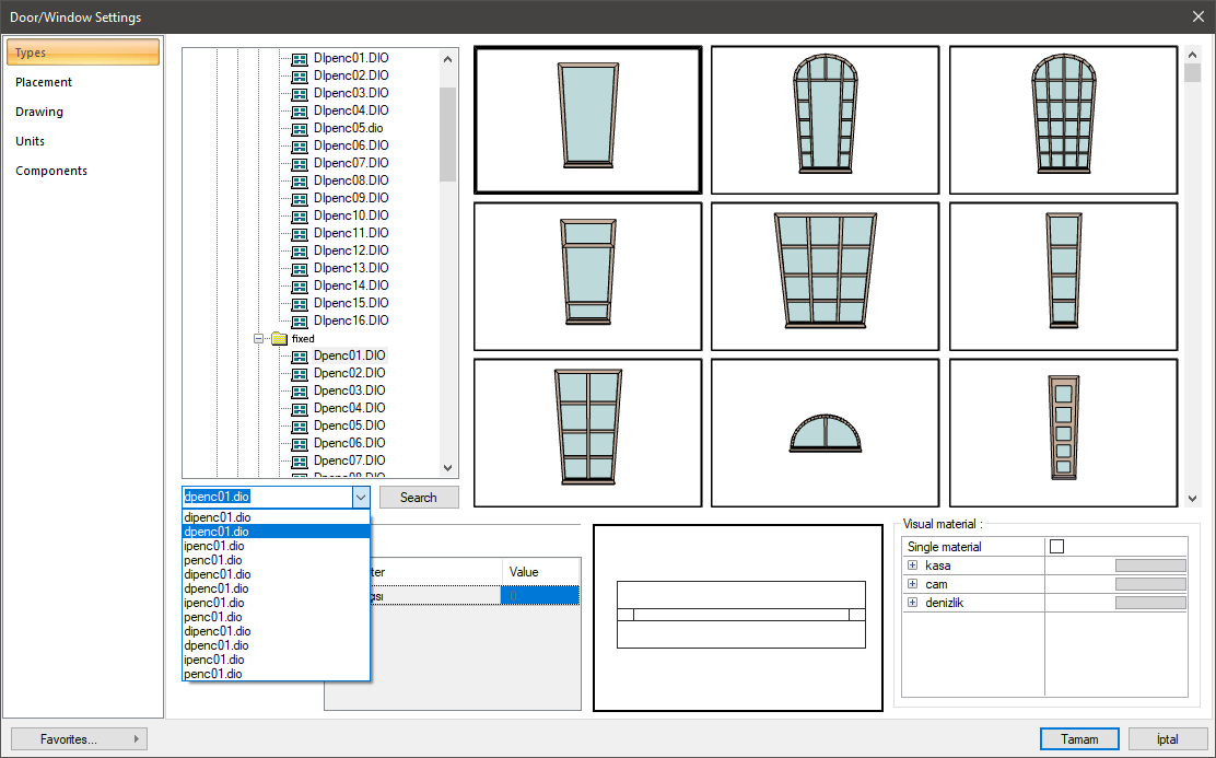 The desired objects and elements in the library, door/window, material menus can be accessed by searching by name.