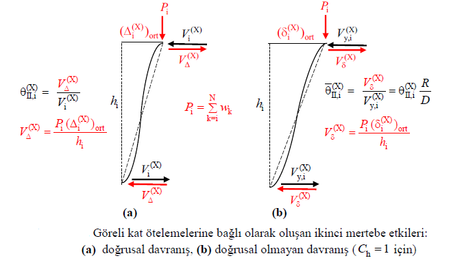 It is necessary to calculate the "second order effects" that occur as a result of horizontal loads (relative floor displacements) occurring in the vertical elements of the bearing system under the effect of earthquake ground motion in general, and should be taken into account in the design. Because these effects cause both "stiffness loss" and "strength loss" especially due to nonlinear behavior in the conveyor system. If both effects take too large values, it may ultimately lead to loss of stability (buckling) in the conveyor system and eventually collapse.