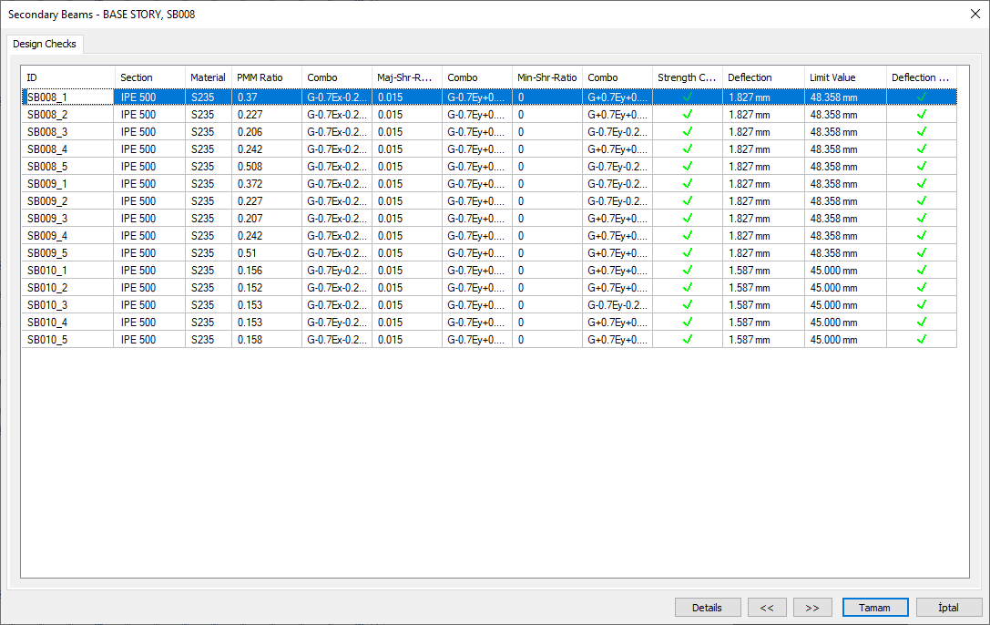 The secondary beam design results and the failure conditions of the steel beams are displayed in the Secondary Beams dialog. The secondary beams dialog displays PMM ratios, combinations and deflection results. In the “ Details ” tab, material and section properties, internal force values, axial compressive strength, bending moment strength in strong and weak axis, design variables and lateral stiffness coefficients (K coefficient, L factor etc.) and PMM ratio are displayed.