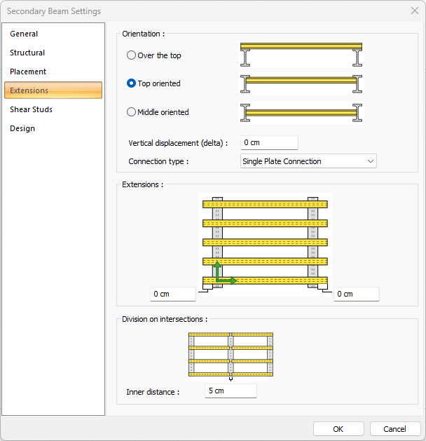 Connection type ![]() Select from the drop-down list for automatically generated slip joints between main steel beam and secondary beams. |
