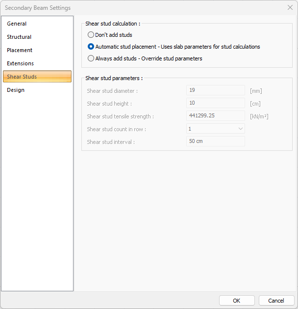 Shear stud parameters ![]() It becomes active if the always add shear stud option is selected, and it is used to determine parameters such as diameter, height, spacing, tensile strength. |