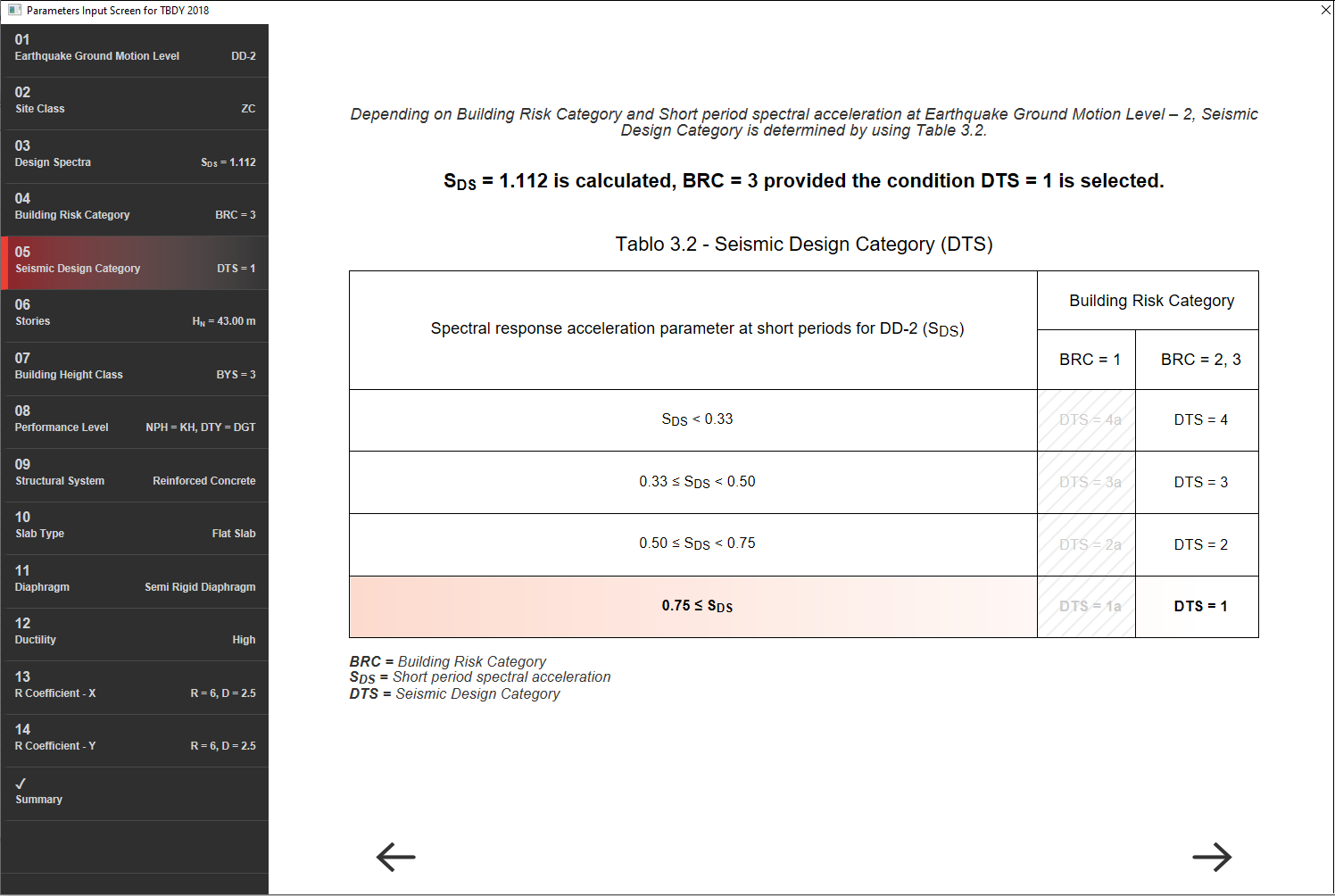 In TBDY 2018 Table 3.2, Seismic Design Category is determined according to the short period design spectral acceleration coefficient SDS and Building Risk Category for DD-2 earthquake level.
