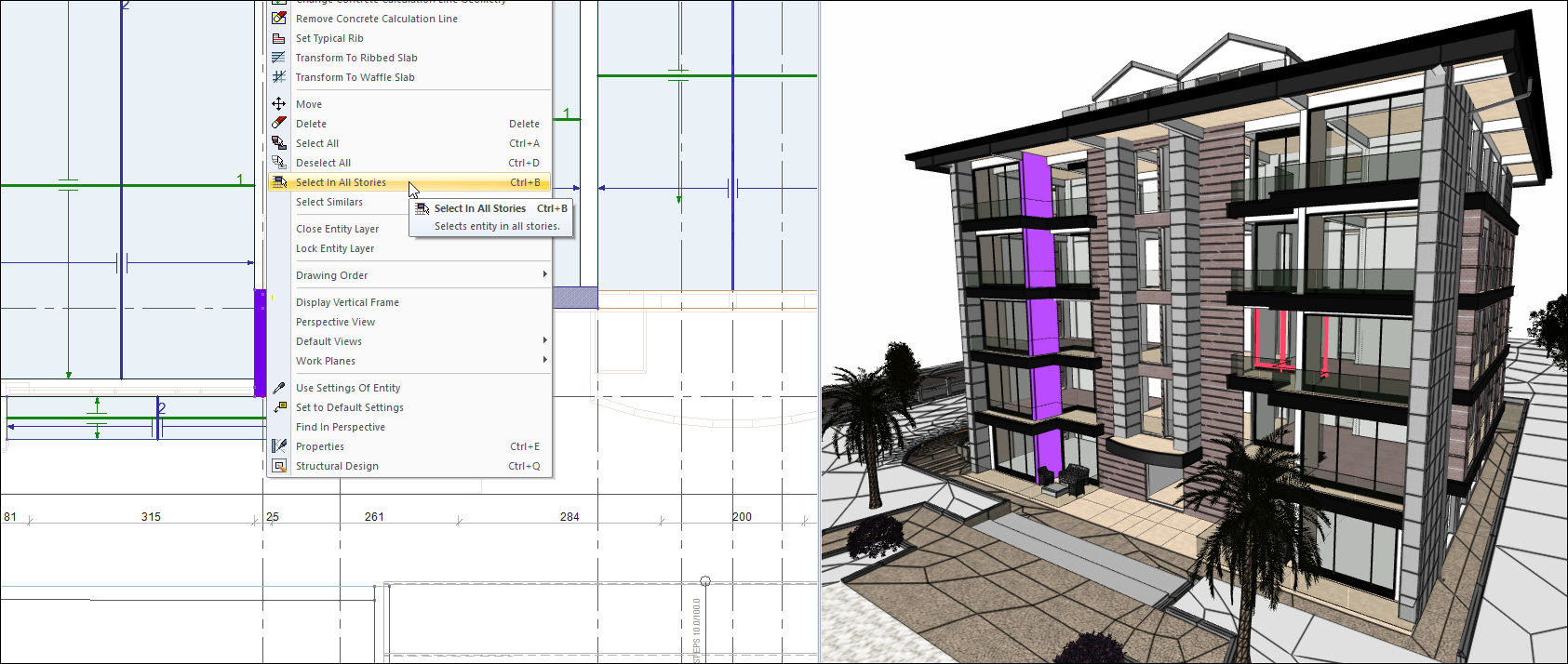To select any object (wall, window, column, etc.) in all stories at once, after selecting the relevant object, right click the "Select in All Stories (Ctrl + B)" command in the menu.