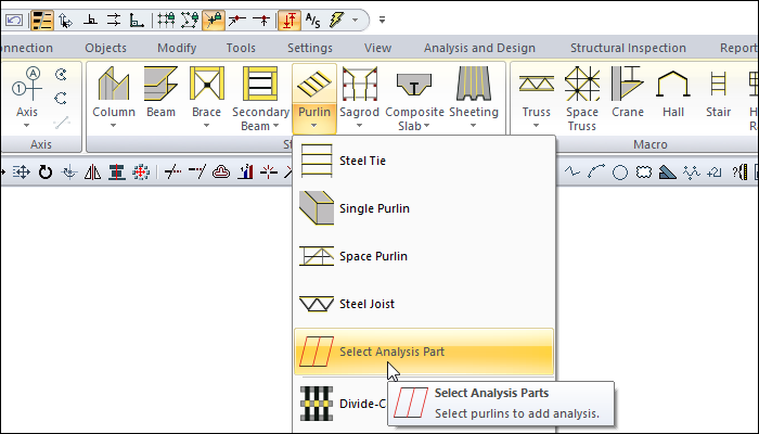 With the Select Analysis Parts command, the purlins to be included/excluded from the analysis model are selected.