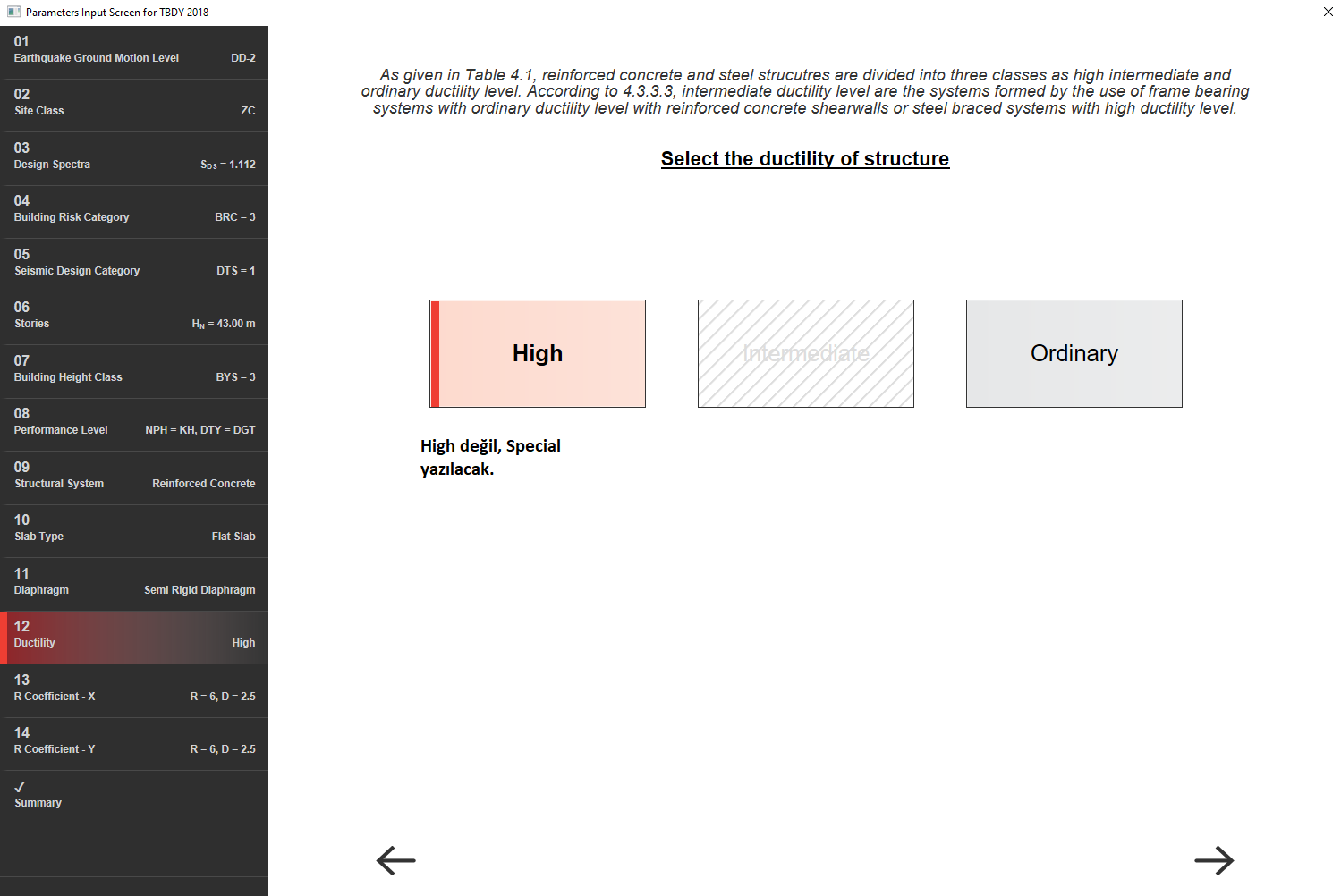 Special ductility, intermediate and ordinary system choices have application limits. The program automatically checks these limits in the wizard within the framework of the items listed below and does not allow ordinary ductility level or intermediate when it is necessary.