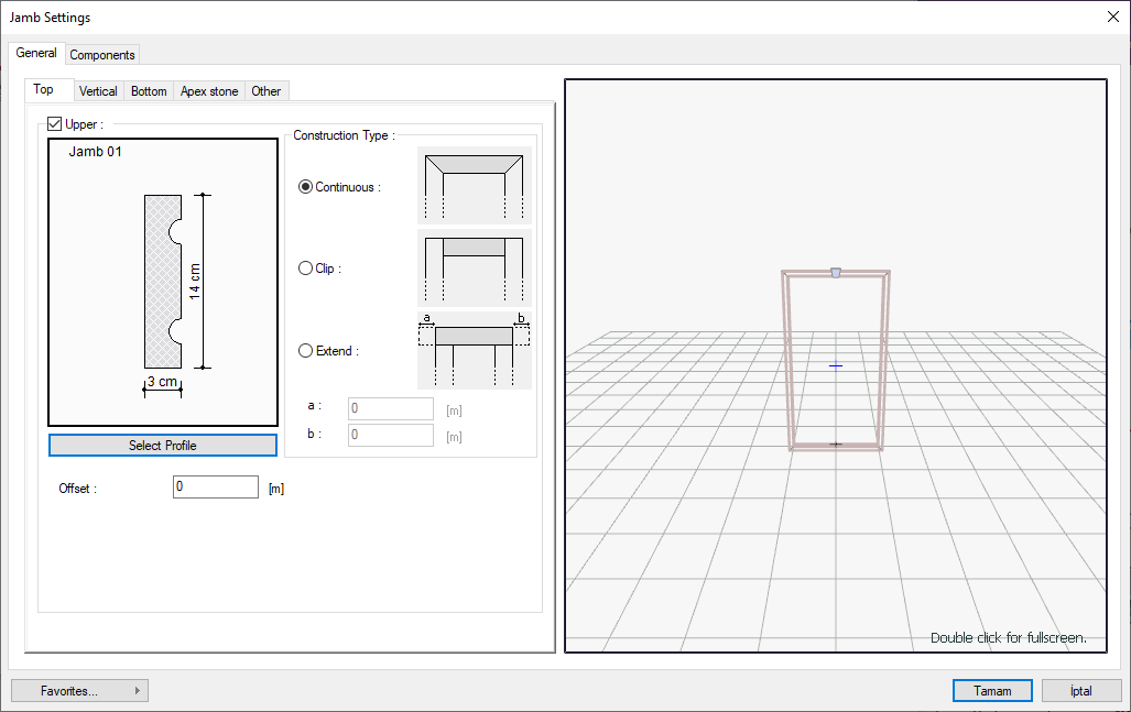 While defining jambs, one of the profiles in the profile archive is selected. Profile archive is accessed from jamb settings. After the jamb is created, its profile is changed by entering the jamb settings.