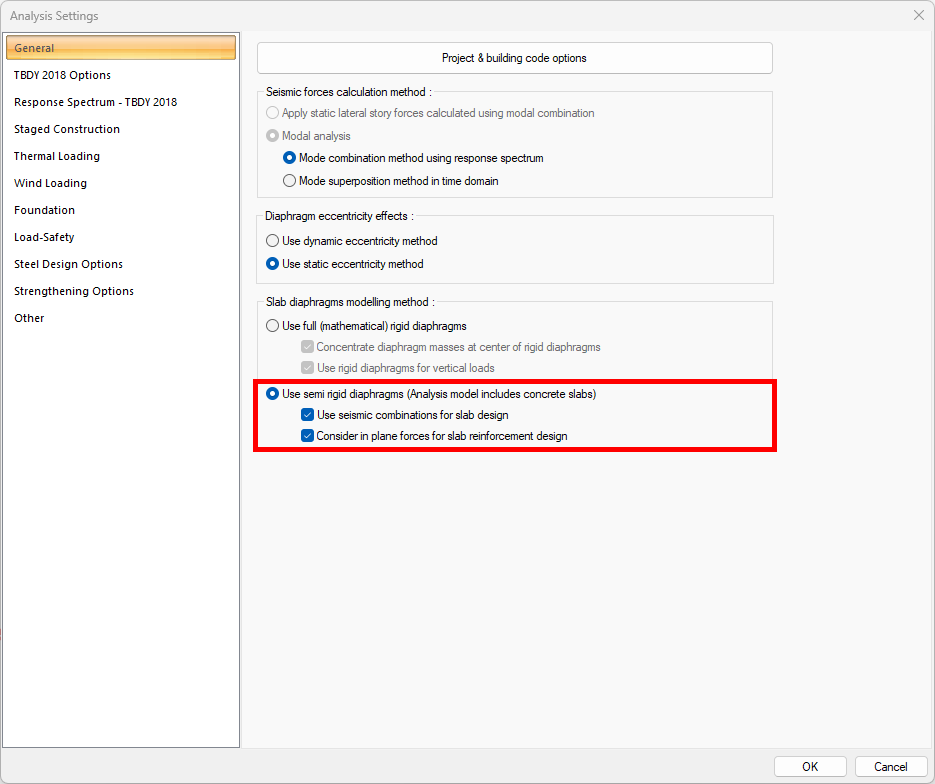 To model a Semi-Rigid diaphragm, select the diaphragm modeling method from the Analysis Settings dialog.