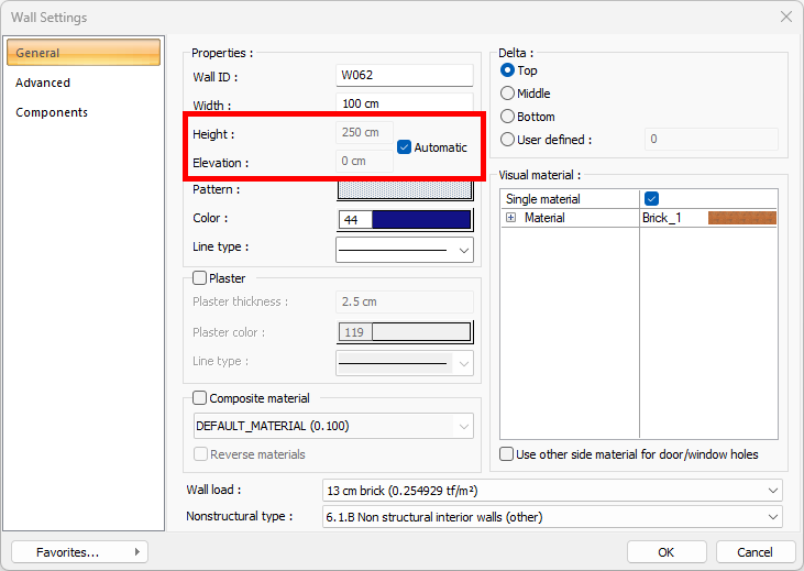 The height value in the wall settings is determined by the user, starting from the story of the story. By activating the automatic feature, the wall elevations and heights are calculated automatically according to the height and elevation values determined in the story settings. When calculating the wall heights, the entered beams and slabs are taken into account.