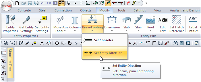 The Set Entity Direction command is used to change the viewing directions of beams and strips. The beam viewing direction can be understood from the directions of the beam texts.