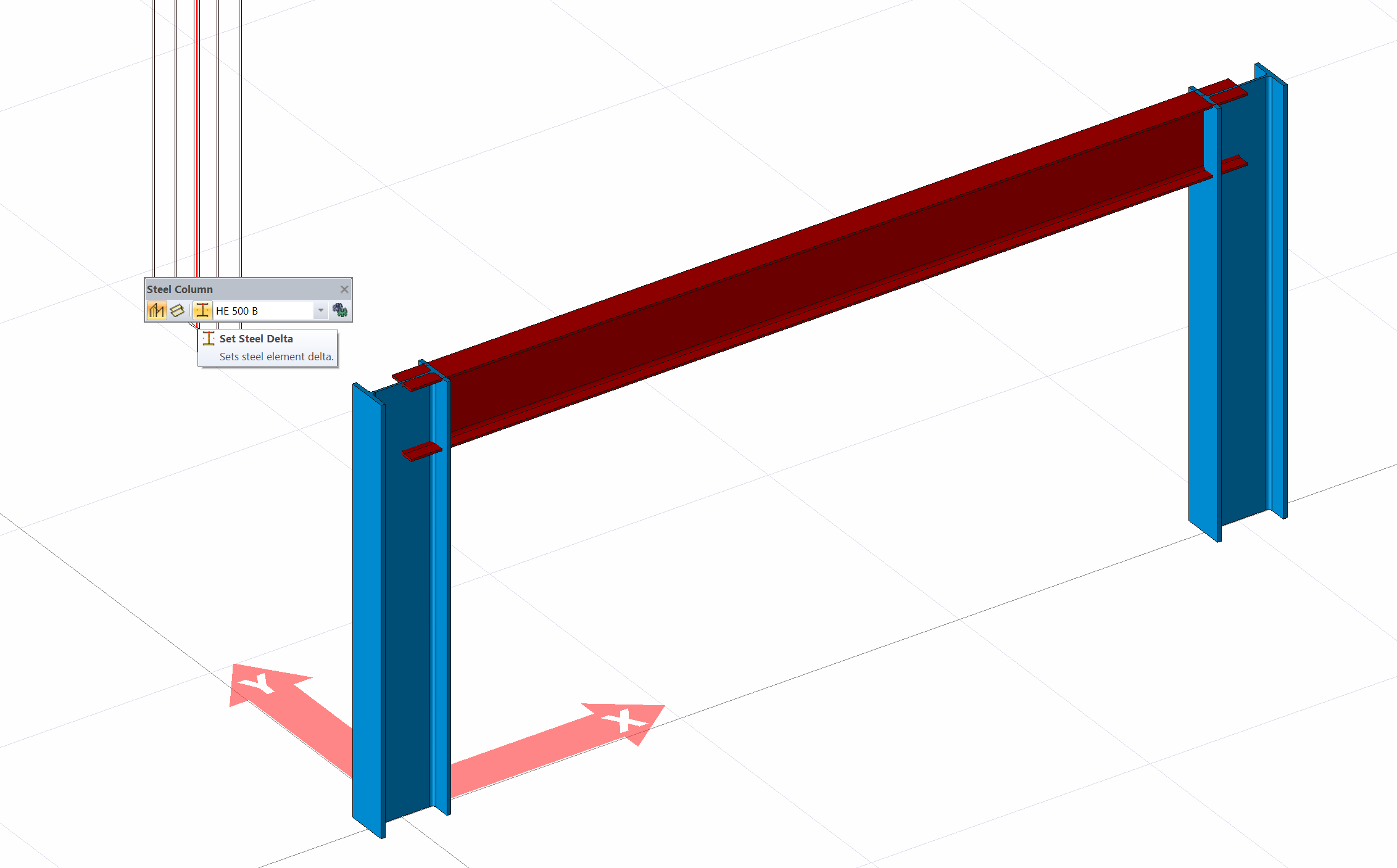 Using Set Steel Delta command, the layout of steel columns and beams can be determined from the three-dimensional perspective view screen. It is used to selectively change the misalignment of steel column and steel beam elements in the perspective view.