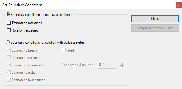 Boundary conditions for solution with building system ![]() If the solution is made with the assumption of semi-rigid diaphragm, the structure - the dome is solved together. In this case, the objects to which the edges of the domes are connected are determined by the options given in the dialog. |