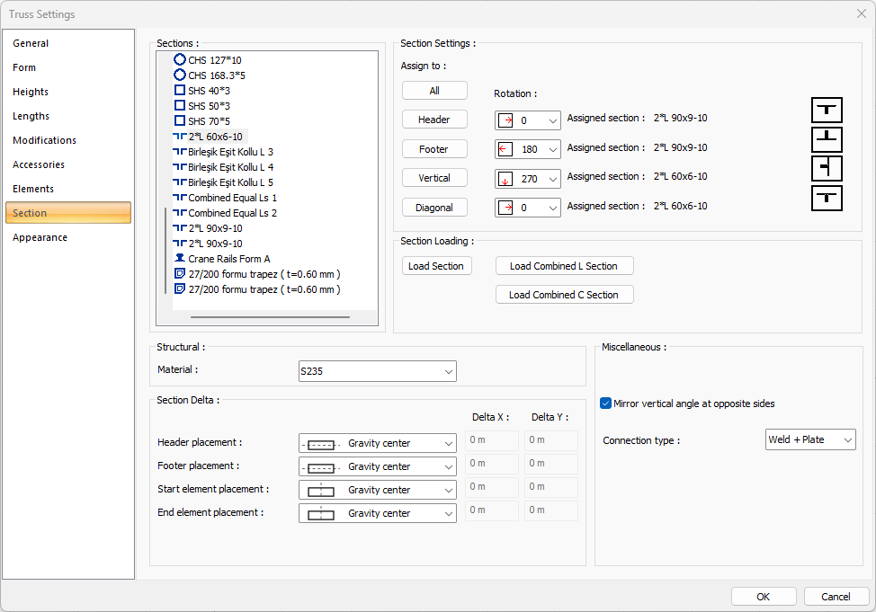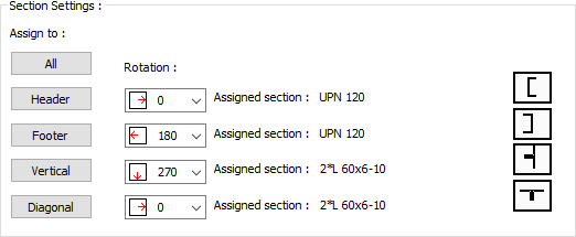 Section settings ![]() The truss elements of the section selected from the list from the profile section are assigned from this section. The selected section can be assigned to all truss elements by clicking the All button, and only the section can be assigned to that element by clicking one of the header, footer, vertical and diagonal buttons. |