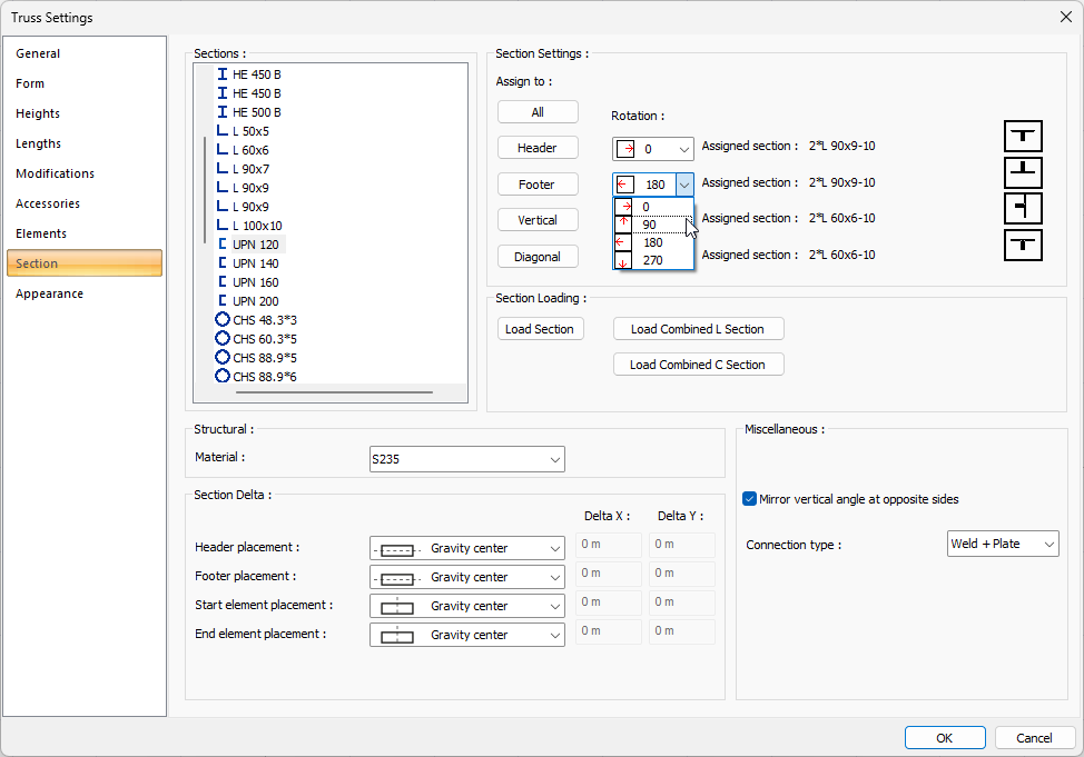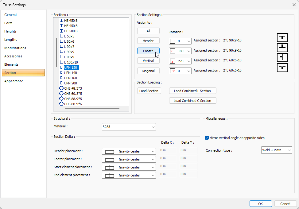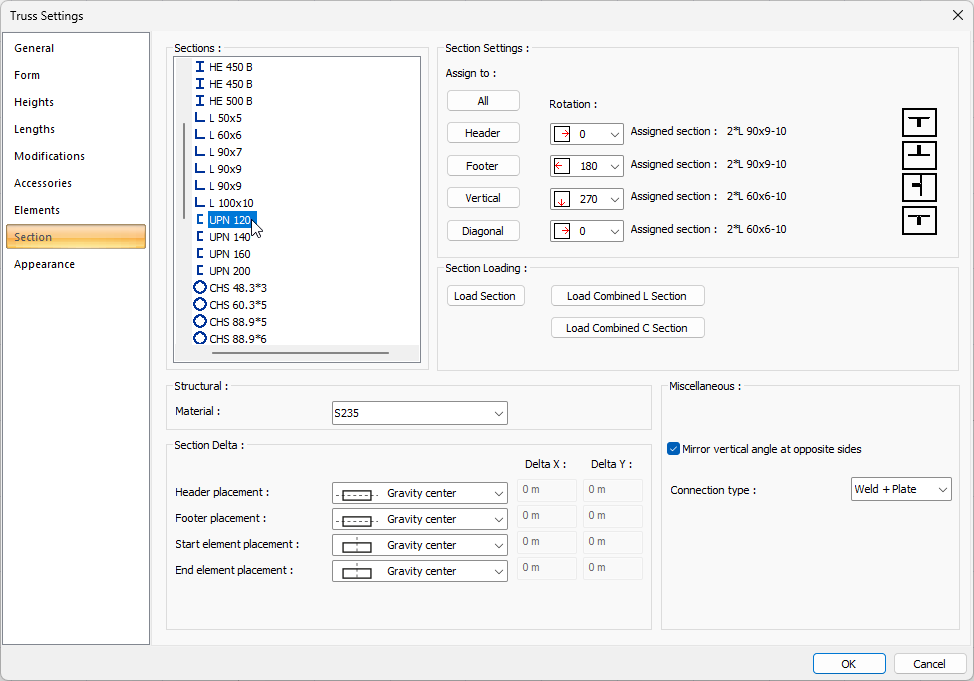 You can choose the sections of your truss for the header, footer, vertical and diagonal. Select the section you want to use from the Sections.