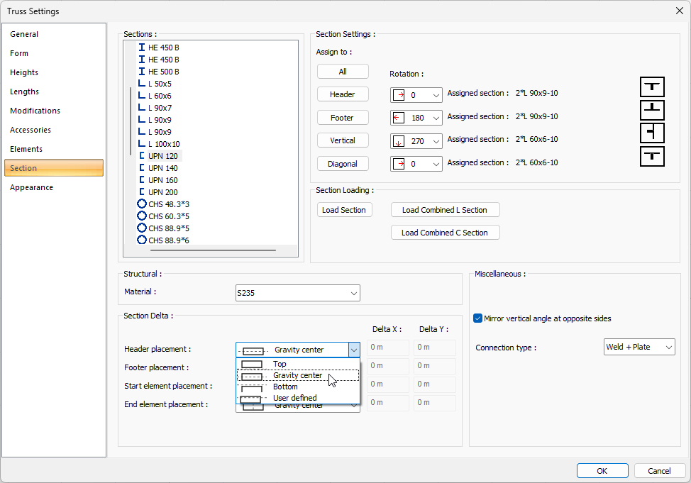 You can choose from top, center of gravity and bottom options for the placement of the truss elements. You can give delta X and Y values by selecting the Defined option.