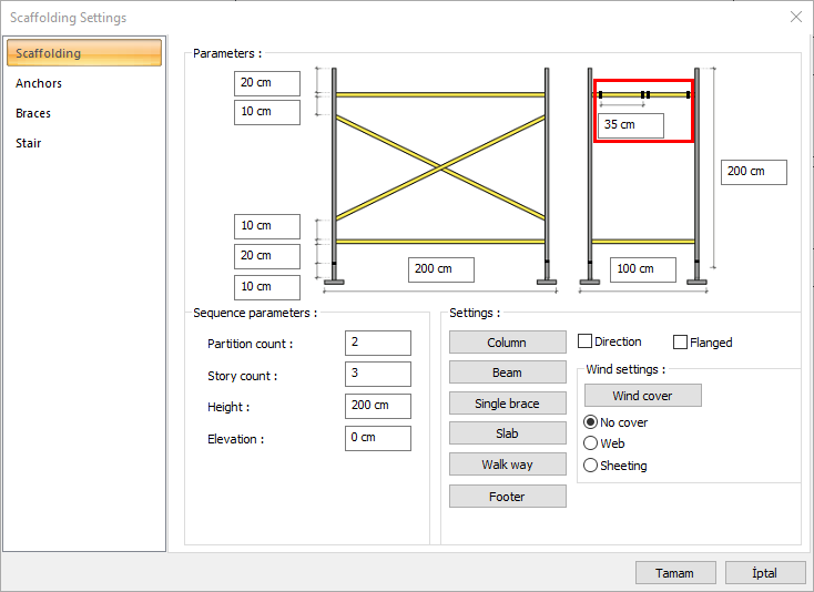 There is slab for 2 side-by-side walk ways at the scaffolding. The value you enter is the width of one. The program automatically updates the other with the same width.