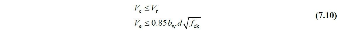 The shear force, V e , calculated according to 7.4.5.2 - 7.4.5.1 will meet the conditions given by Equation (7.10) . If the second condition in Equation (7.10) is not fulfilled, the earthquake calculation will be repeated by increasing the cross-section dimensions as necessary.