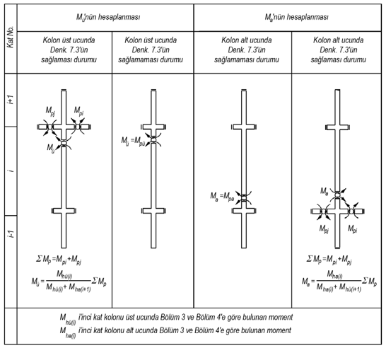 In cases where a more precise calculation is not made, M pi ≈1.4 M ri and M pj ≈1.4 M rj can be taken. ∑ The moment M p will be distributed to the columns in proportion to the moments obtained according to Section 4 at the joining ends of the columns, and the moment obtained at the lower or upper end of the relevant column as a result of the distribution will be considered as M a or M u in Equation (7.5) . Equation (7.6) will be applied separately for both directions of the earthquake and the maximum obtained in each direction ∑ M p its value will be based on distribution.