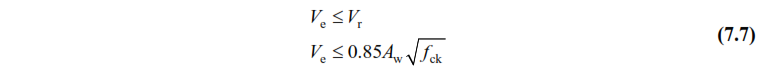 7.3.7.5 - Shear force calculated by Equation (7.5) , V e , the shear force calculated under the combined effect of vertical loads and earthquake loads multiplied by the load coefficients shall not be taken less than V d and will also meet the conditions given in Eq. (7.7). . In case the second condition in Equation (7.7) is not fulfilled, the earthquake calculation will be repeated by increasing the cross-section dimensions as necessary.