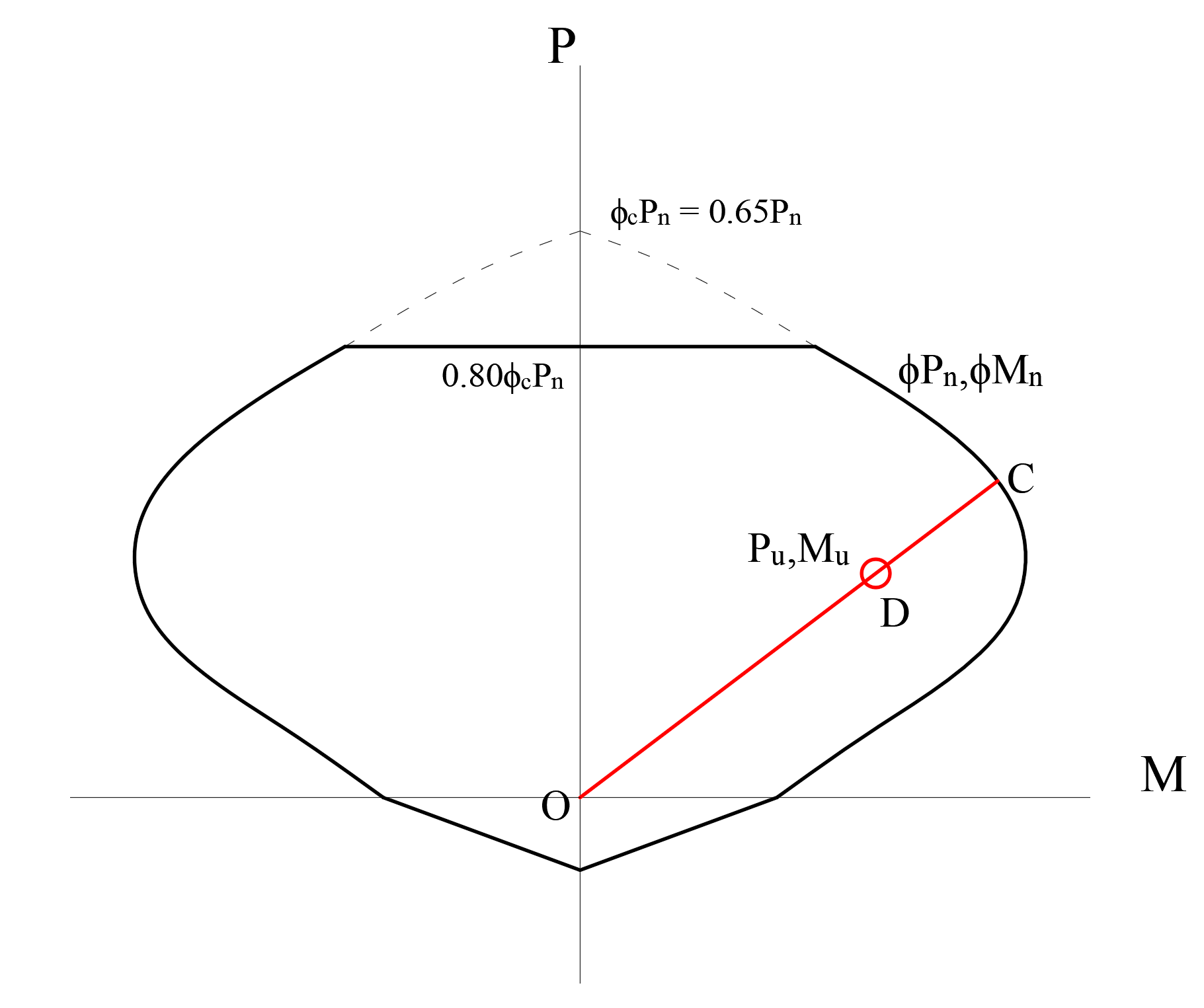 Because of the axial force and biaxial bending interaction in shear walls, the demand/capacity ratio is calculated using the interaction curve. The point (Pu, Mu) is placed in the interaction space shown as point D in the picture below. If point D (Pu, Mu) is within the acceptable range, the column's capacity is adequate. However, the shear wall is overstressed if point D (Pu, Mu) is outside the interaction volume. The capacity ratio is calculated using point C obtained by extending the line passing through points O and D to the interaction curve. The capacity ratio is given by the ratio OD/OC.