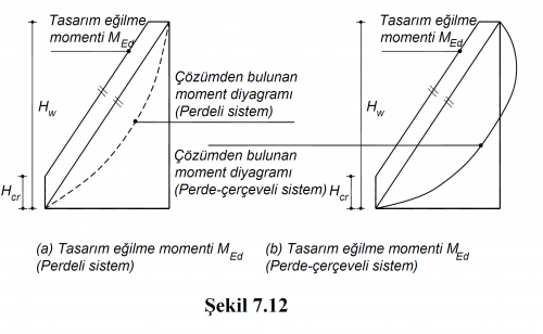 In walls meeting the H w / l w > 2.0 condition, the design bending moments are considered as a constant value along the critical wall height (H cr ) . This constant value is taken equal to the bending moment calculated according to Section 4 at the wall base. Above the section where the critical wall height ends, a linear moment diagram parallel to the line combining the moments calculated at the base and top of the wall is applied (TBDY Figure 7.12) .