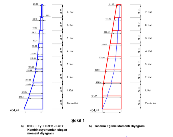 Moment value was found as 434.47 tfm at the lower end of the ground floor curtain. This value will be used as the design bending moment value along the critical wall height (H cr = 4.25m) . In the section above the section where the critical wall height ends, a line is drawn from the moment value (434.47 tfm) at the lower end of the ground floor curtain to the moment value (29.43 tfm) at the top end of the top floor. Then, a line parallel to this line is drawn from the section where the critical wall height ends, and the design bending moment diagram shown in Figure 1b is obtained in the middle. The curtain design is made using this moment diagram.