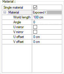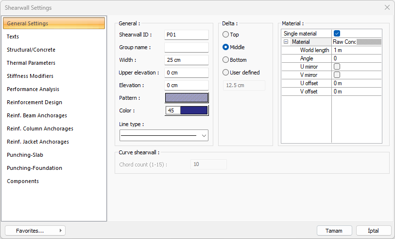 Material ![]() The material to be used on the front, backt and other surfaces of the shearwall is selected from the list. Surfaces are covered with the selected material and displayed as such in renderings. Texture length is entered into the world length. For example; If 1 is entered, the selected material texture is taken as 1 meter and covered on the relevant walls. In the angle, the angle of the texture is entered. Touch the U and V offset. The motion value in the x and y plane is entered. With U and V mirroring, the texture is symmetrical with respect to the y and x planes. By selecting the single material option, the material selected in "Front material" is used on all surfaces of the shearwall. |
