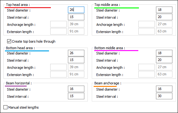 Manual steel lengths ![]() When the option is selected, the inactive anchorage and extension length options become active. The user determines the anchorage and extension length manually. |