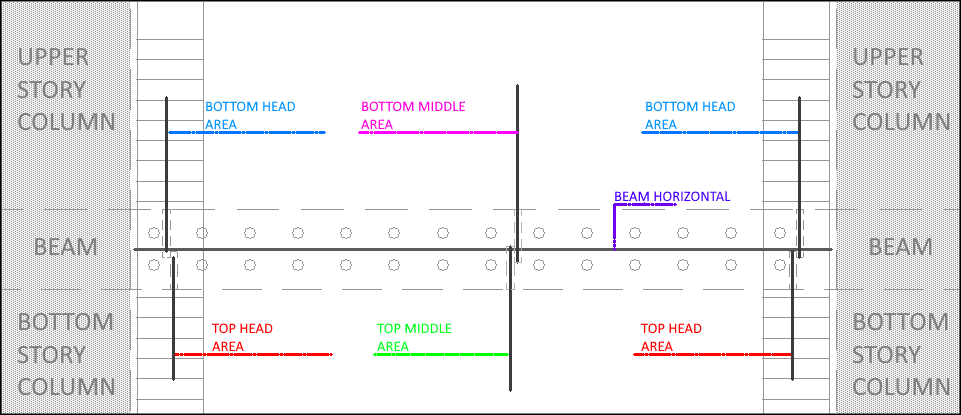 The regions and reinforcement positions of the anchorages are shown below according to the colors given: