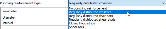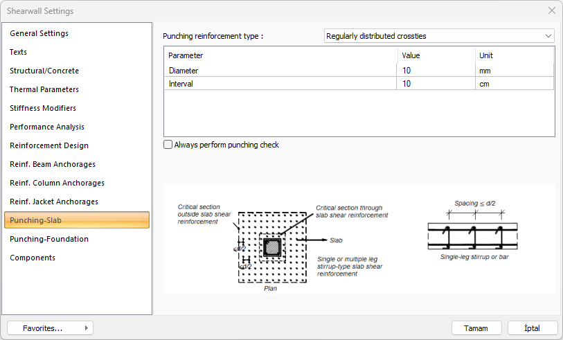 Punching reinforcement type ![]() Punching reinforcement types described in Article 7.11.11 and Article 7.11.12 of TBDY 2018 can be selected from the list for the vertical bearing element being treated. If stapling reinforcement will not be used, "No punching reinforcement" type can be selected. You can edit the values given in the dialog according to the type selected. |
