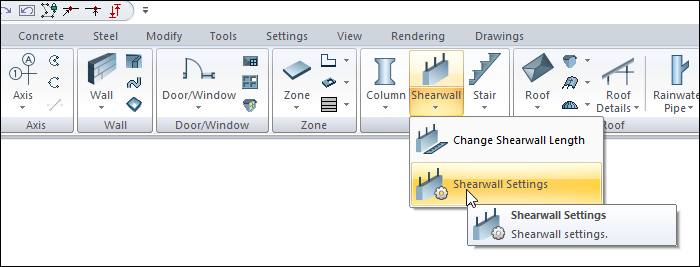 With the Shearwall Settings command, the settings of the concrete shearwall such as drawing, offset, material selection, structural material can be accessed.