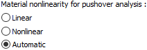 Material nonlinearity for pushover analysis ![]() By selecting one of the linear, nonlinear (distributed plastic behavior) and automatic options, the material model defined in the shearwall is determined while performing nonlinear pushover analysis. |