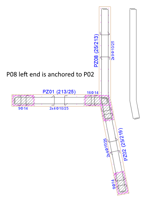 Left anchorage override/Right anchorage override ![]() In the case where three or more shearwalls are joined, the anchorage of the shearwalls can be user-defined. The drawing can be taken in the following figures by changing the "Left anchorage override" parameter of P08 shearwall as user-defined. ![]() ![]() ![]() ![]() |