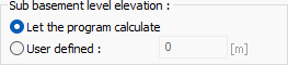 Sub basement level elevation ![]() The sub-basement level elevation for foundation is found automatically. In some special cases, the desired sub basement level elevation can be entered manually in the box by using the user defined option. |