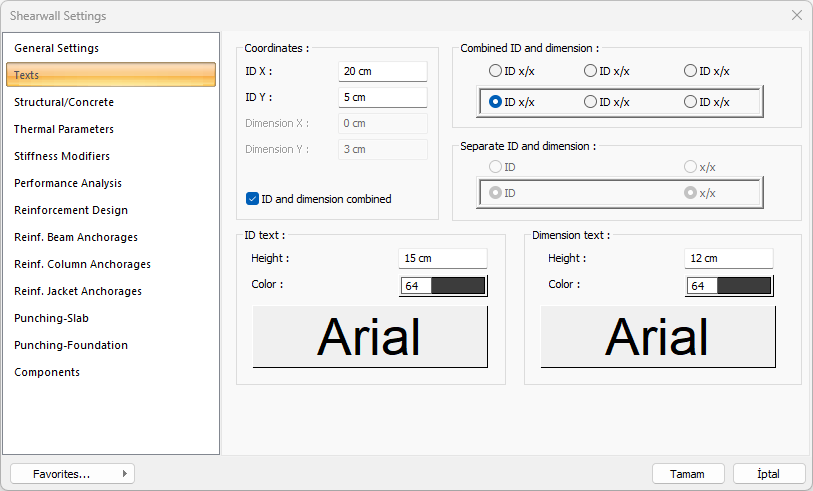 ID X/ID Y ![]() X and Y coordinates of the shearwall Name text are entered according to the upper left (if the text is on the shearwall) or the lower corner (if the text is inside the shearwall). If the X value is positive, the text moves from the edge to the right, and if negative, it moves to the left. If the Y value is positive, the text will scroll up, and if it is negative, the text will scroll down. The directions specified here should be considered according to the viewing direction. If the name and size are printed together, the letters are placed according to these coordinates. |