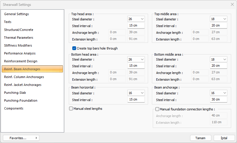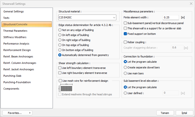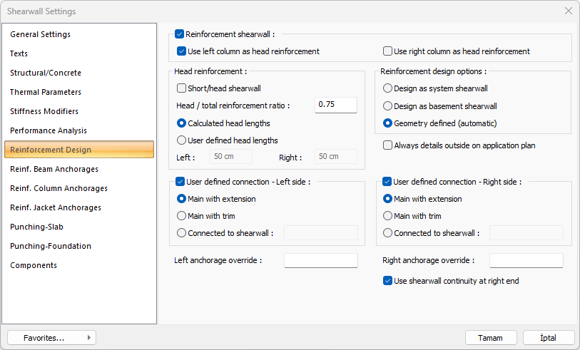 Head/total reinforcement ratio ![]() The default value is 0.50. This parameter; The wall end zone creates a lower limit for the amount of wall end reinforcement according to the total amount of reinforcement in the walls to be arranged. In other words, the amount of end reinforcement is determined at least as much as the ratio given to this row, besides the regulation conditions. For example, given the value 0.5, if the amount of reinforcement required for the whole wall is 100 cm2, 50 cm2 is placed in the middle area and 25 cm2 reinforcement is placed in the end regions for the left and right. Placed reinforcements are not selected less than the required reinforcement as per the regulation. |