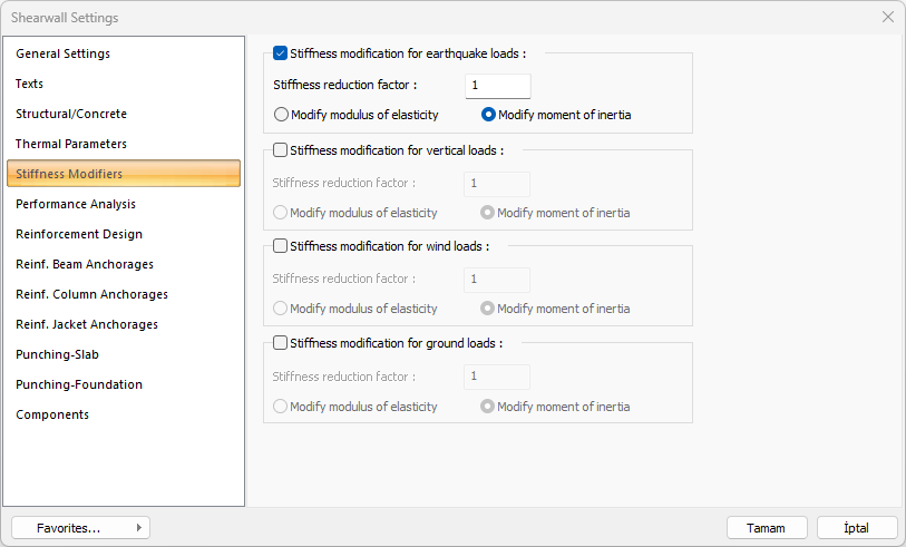 Stiffness modificatiın for earthquake loads ![]() Shearwall stiffness can be reduced by a specific anchoragevalue separately for earthquake, vertical, wind and soil thrust loads. Stiffness reduction can be applied optionally on the basis of element elasticity modulus or moment of inertia. E = Reduction Factor * E or I = Reduction Factor * Applied as I. |
