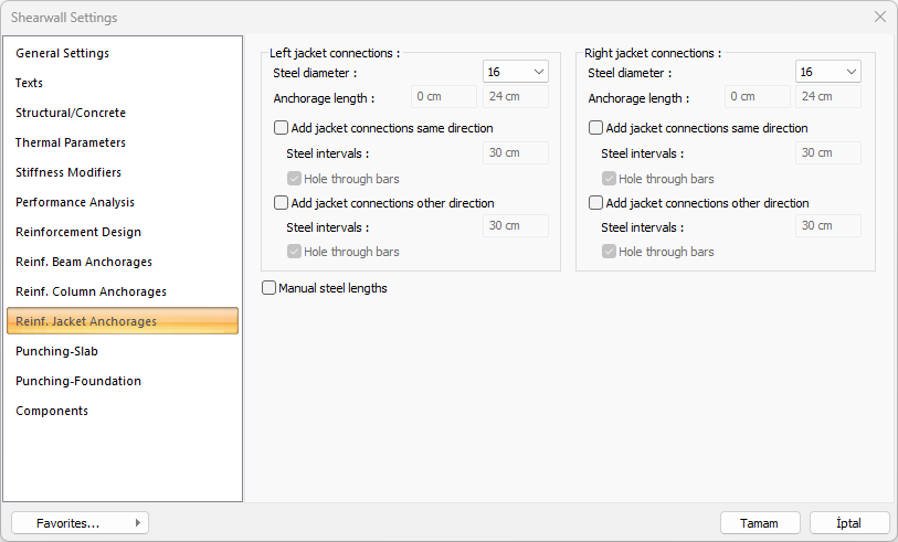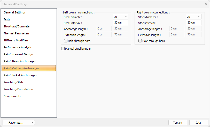 In this tab, the settings of the reinforcement jacket anchorages of the mantle made column elements located on the right and left of the reinforcement shearwall are made.