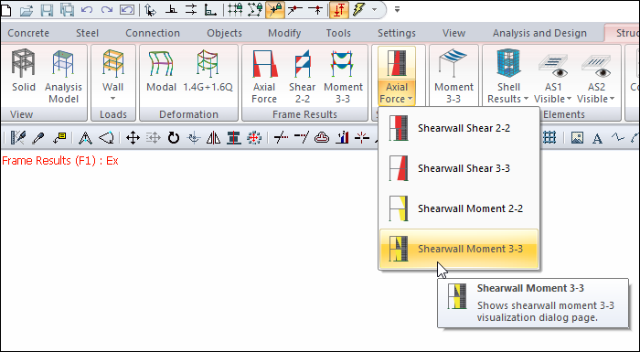 You can access the Shearwall Results tab by clicking one of the axial force, shear force and shear moment commands under the Shearwalls heading under the ribbon menu Structural Inspection tab .
