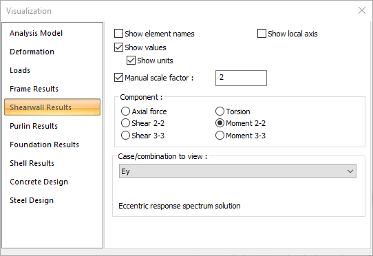 Case/combination to view ![]() By selecting the appropriate load combination from the list, the internal forces generated in the shearwalls due to this combination, selected in the component tab, can be graphically examined on the structure. |