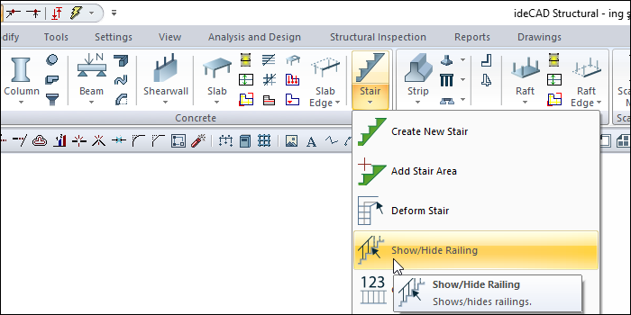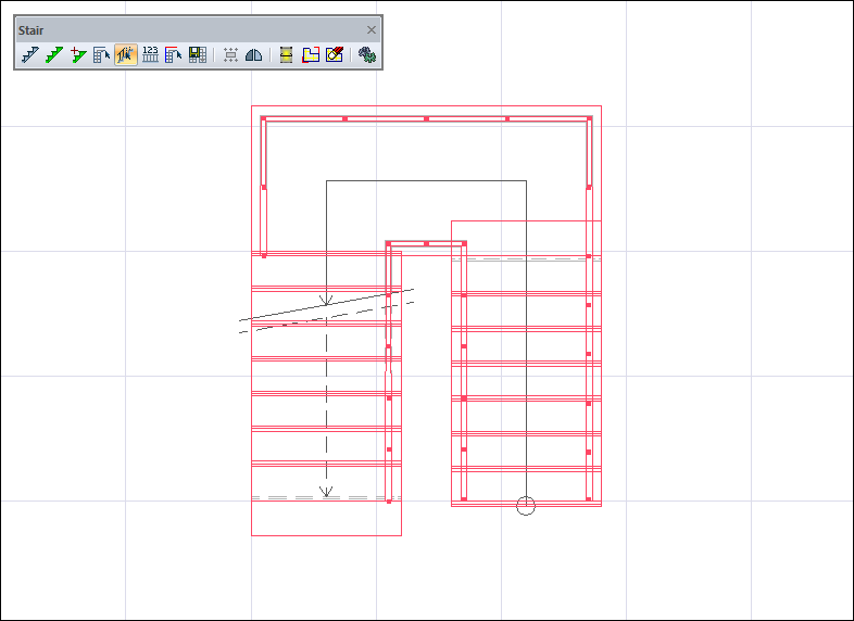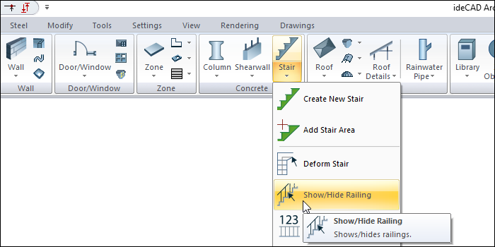 With the Show/Hide Railing command, the railings on the stairs are hidden or the hidden railings are shown. Stairs taken from the stair library have railings on both sides. After the stair is placed in the drawing area, the railings on the sides of the stairs where there should be no railing are removed.
