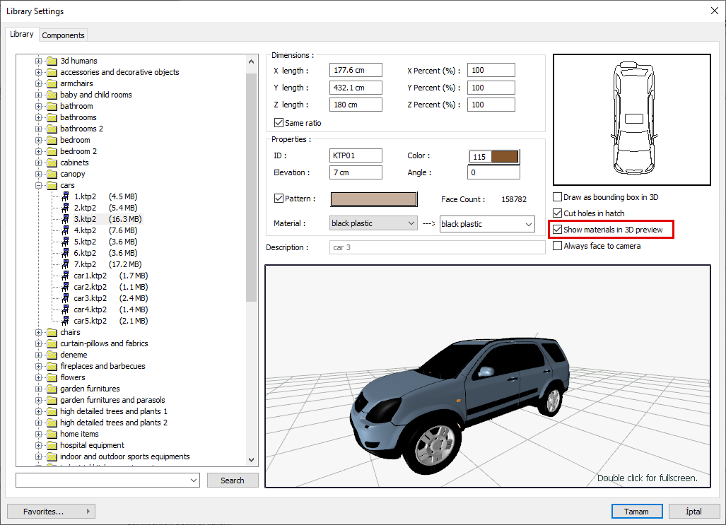 With the Show materials in 3D preview feature, the selected library object in the library settings dialog is displayed in the perspective preview with its materials.