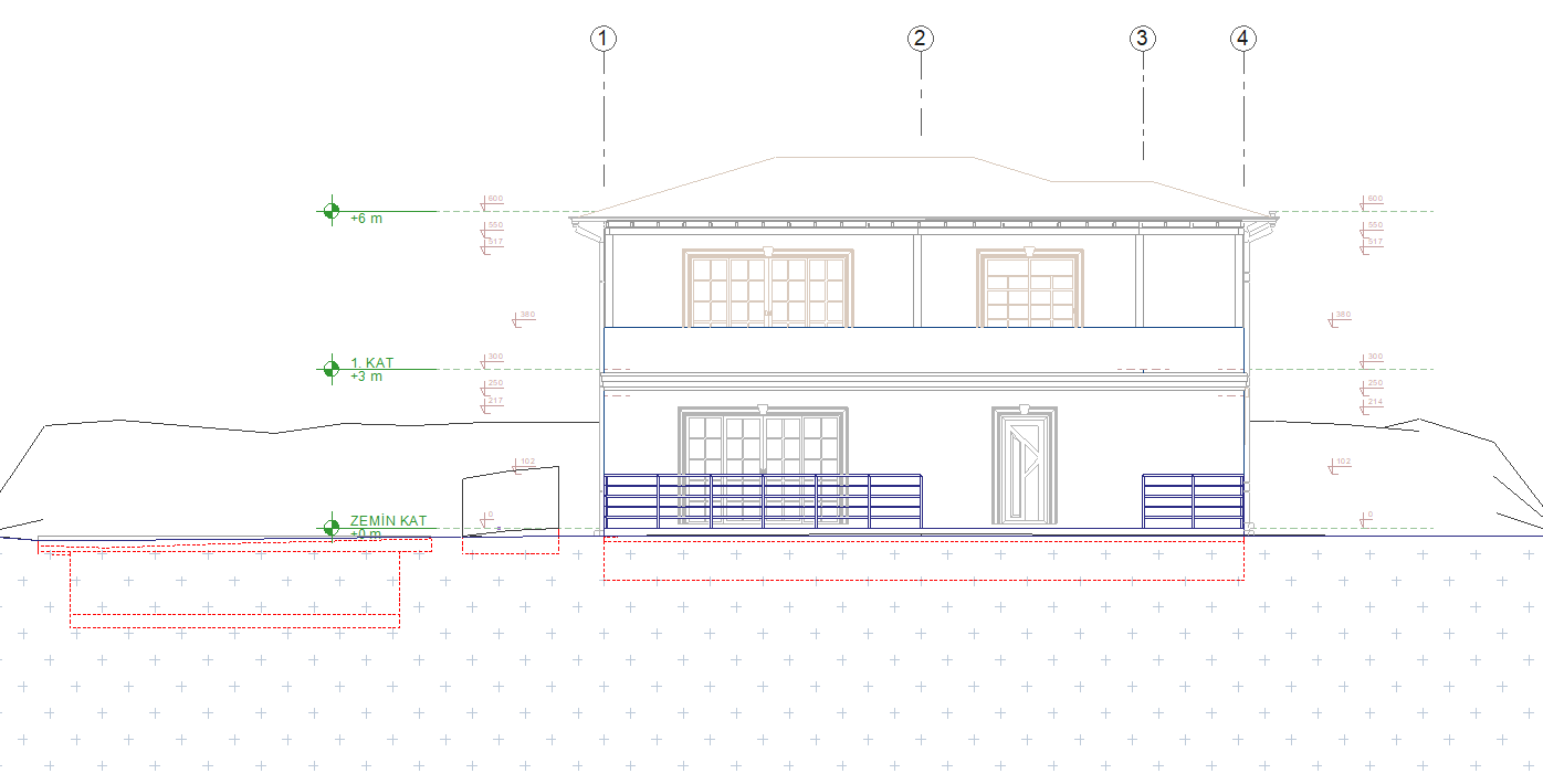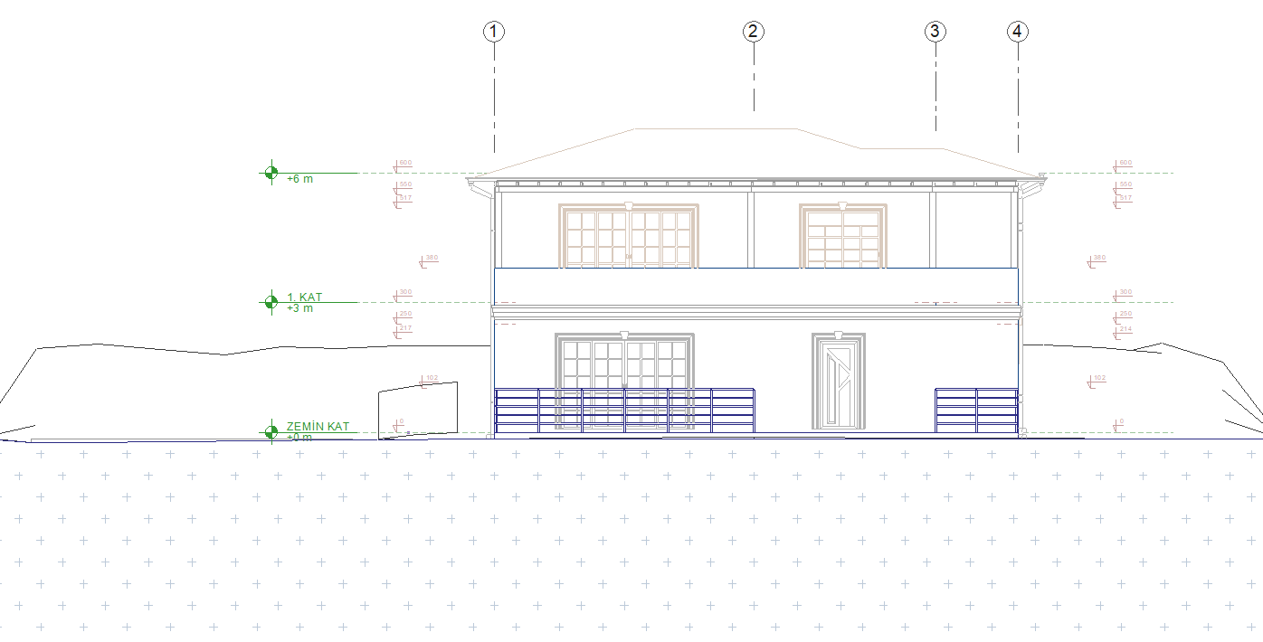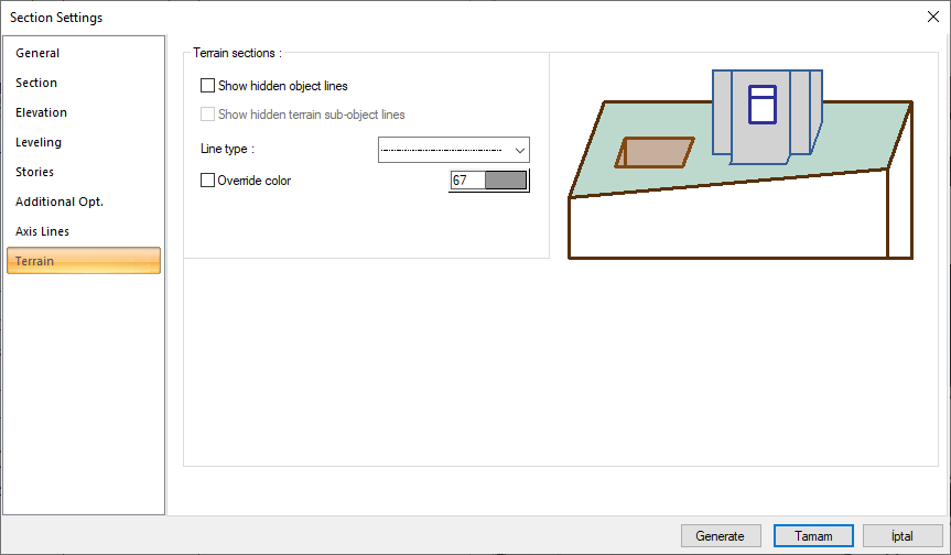 In the section/elevation, the visibility of the lines belonging to the objects within the terrain, line types, etc. are made from the terrain sections settings. Objects and terrain lines hidden in the terrain are optionally displayed.