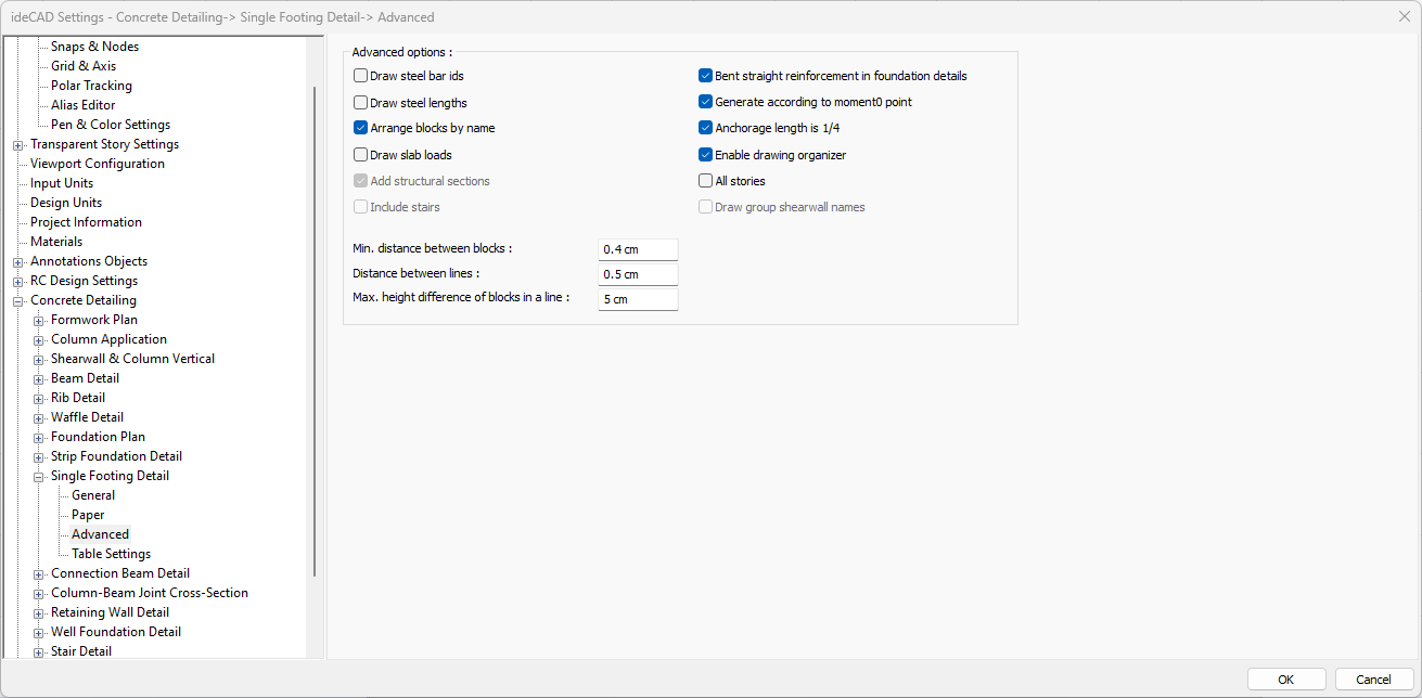 Distance between lines ![]() Minimum vertical distance between blocks is entered. The block is each opening itself, with its rebars, sections and dimensioning. |