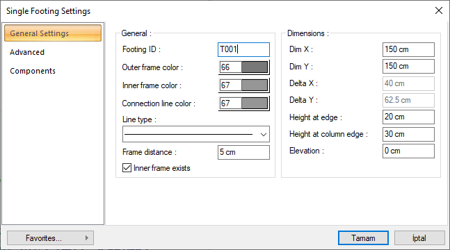Footing ID ![]() It is the name of the single footing. The letter T is placed in front of the number entered here and the name of the single footing is created and written on the footing in the plan. The number is increased according to the order in which the footings are drawn (such as T1, T2, T3 ....). The single base names can be changed later using the Name Object command. The name index does not have to be T. Different indices can be used for renaming. |