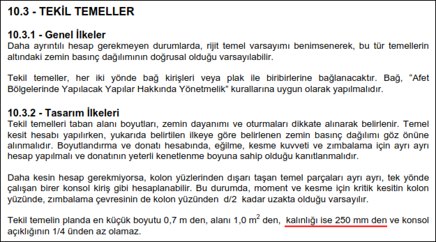 Single footing thickness cannot be less than 25 cm. (TS500 10.3.2)