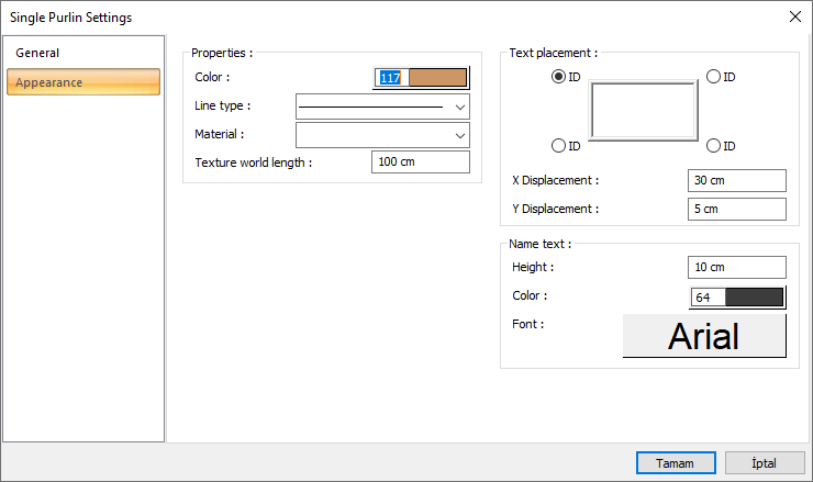 Name text ![]() The height of the purlin name text is entered. The color box is slid over the color palette that is opened by clicking and holding down the button with the left mouse button. The button is released when the desired color is reached. The color box turns into the selected color. If clicked together with the Shift key, the pen thickness of the relevant color can be adjusted. If the button below is clicked, the Font Settings dialog opens. Purlin Name Text, font type is set from this dialog. |